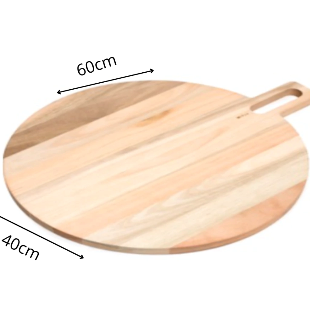 Prepara y sirve tus pizzas favoritas con nuestra Pizzera Eucalipto. Con unas dimensiones de 40cm x 60cm x 2cm, esta pizzera es perfecta para pizzas grandes y otros platos horneados. Fabricada con madera de eucalipto de alta calidad, garantiza una superficie duradera y resistente. Su diseño redondo y elegante añade un toque rústico y sofisticado a tu cocina, haciendo que cada comida sea una experiencia especial.
